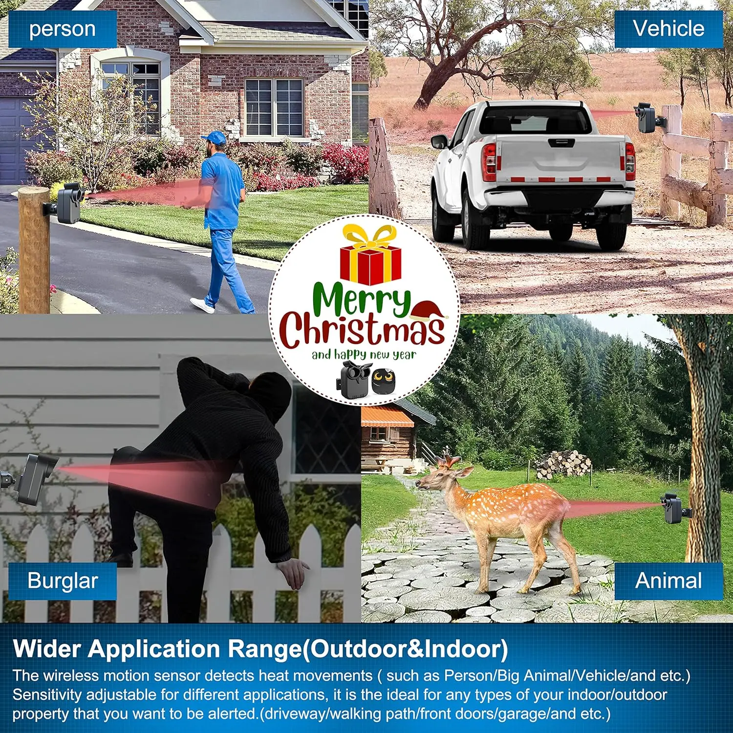 -- Up to 1/2 mile long wireless transmission range(ideal conditions),it is a great solution even to monitor the long driveway/large property/and etc; --Up to 50FT wide sensor detection range and 2 adjustable sensitivities(High=50ft;Low=35ft),ideal for driveways, walking paths,yard,garage,gate,pool and anywhere of your outdoor/indoor property you want to be alerted.