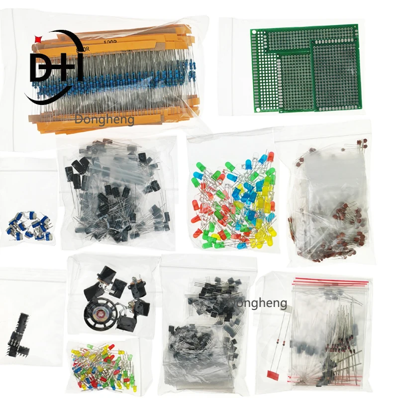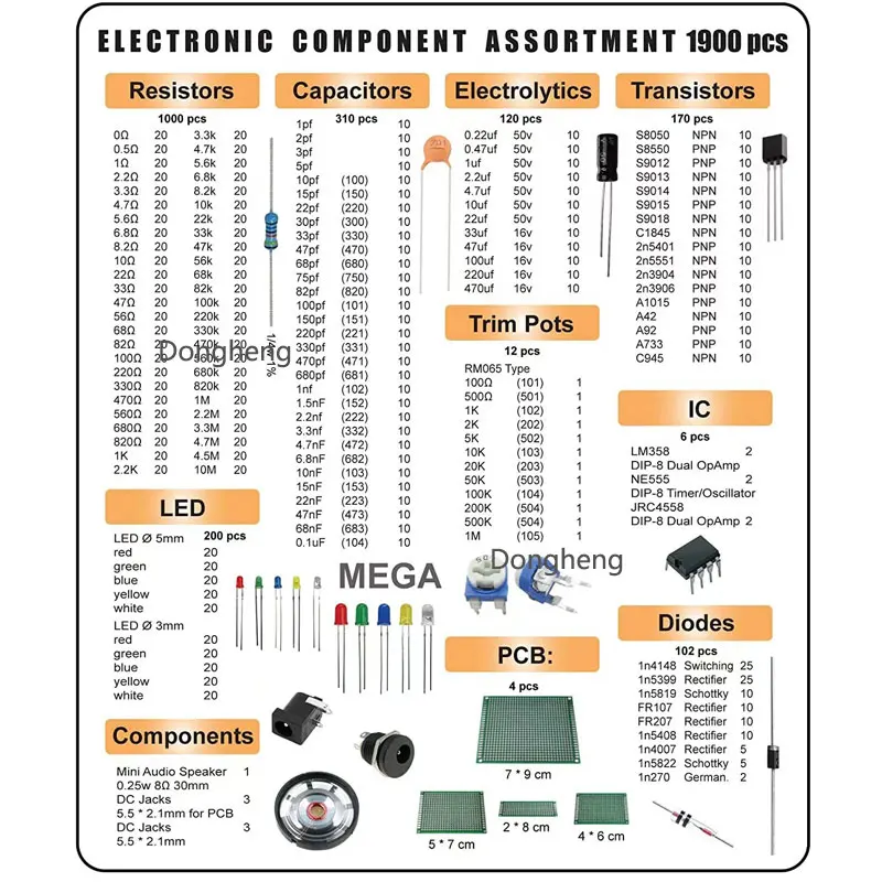 * 1000 pcs Resistor, 180 pcs Transistor, 120 pcs Electrolytic Capacitors, 100 pcs Diodes, 200 pcs 3mm 5mm LED, 300 pcs Ceramic Capacitors, 3 pcs DC-022 3 pcs DC-005 DC jacks, 2 pcs LM358, 2 pcs NE555, 2 pcs JRC4558, 1 mini speaker, 2 pcs 1n270 Germananium Diode, 2 pcs Germanium Transistor, 12 pcs Trim Potentiometer, 4 pcs PCB