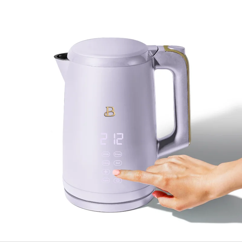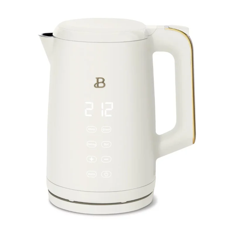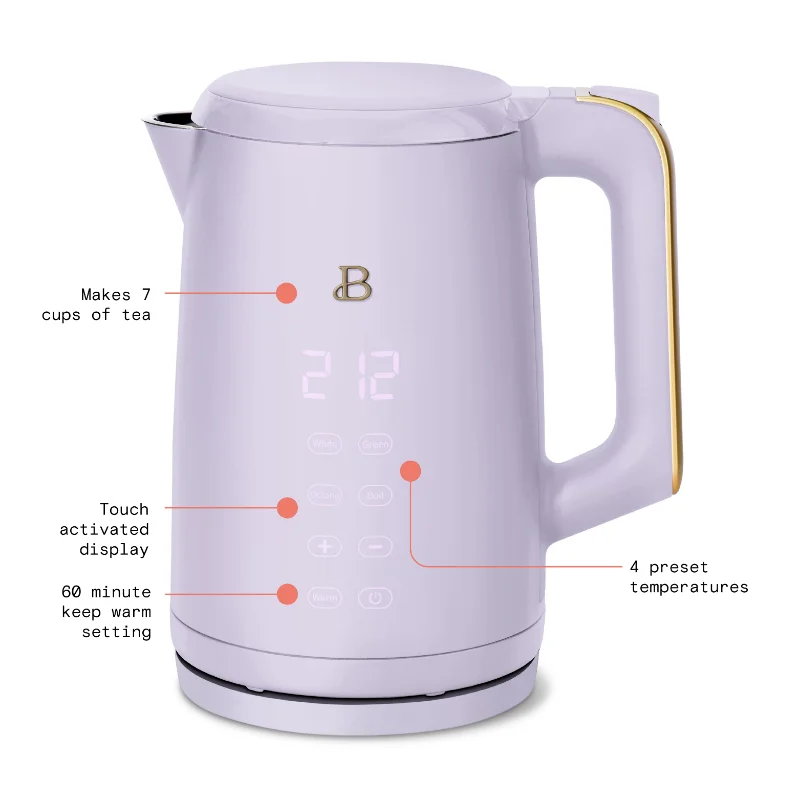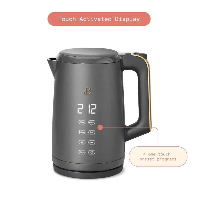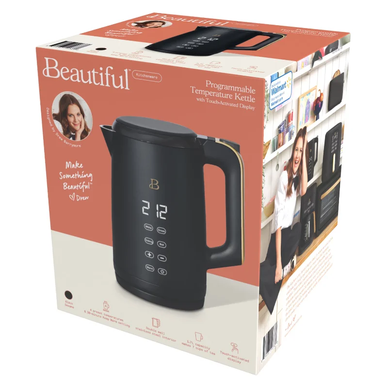 Tea that tastes just right. Boil 7 cups of water in under 7 minutes with the Beautiful 1.7L Programmable Temperature Kettle with Touch Activated Display. Thoughtfully designed with sleek touch-activated illumination and our signature gold accents, the Beautiful Kettle is made for your kitchen and your lifestyle. Complete with 4 one-touch preset programs for white, green, oolong and black teas so every cup is brewed to perfection. Created by Drew Barrymore, Beautiful Kitchenware™ combines elegant design, contemporary colors and modern silhouettes for high-performance appliances that look beautiful on your kitchen counter.