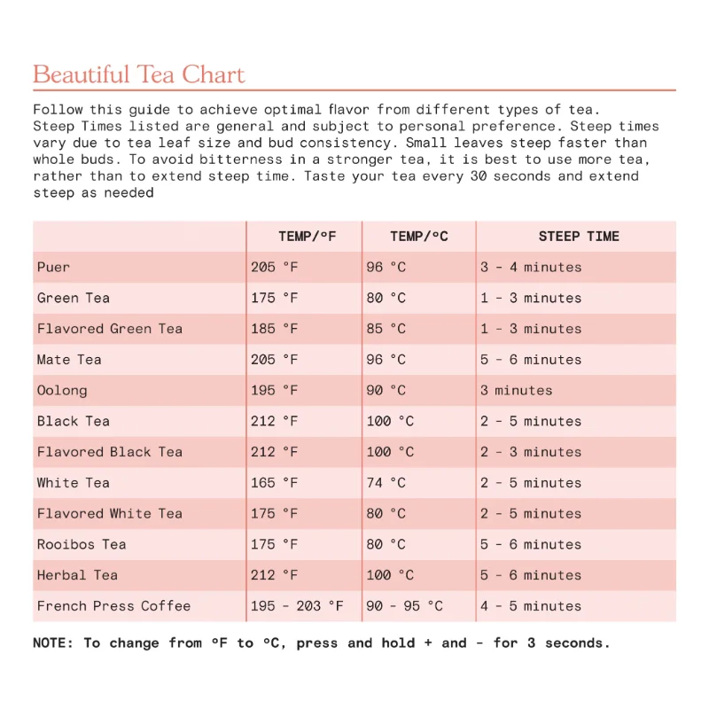 - 4 one-touch preset programs and adjustable temperature settings ensure ideal temperatures for all kinds of tea: White 165°F, Green 175°F, Oolong/Coffee 195°F, Black/Boil 212°F.