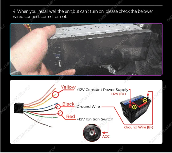 3. When your car radio screen "flashes" or displays the words "Start Reverse", "No Signal", "Start Reverse" (as shown in the picture below), please check the cable connection and disconnect the "Reverse/Backup Cable". This is important.4. When you install well the unit,but can't turn on, please check the belower wired connect correct or not.
