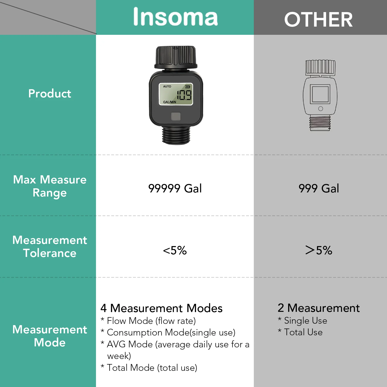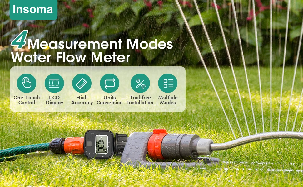 With our Insoma water flow meter, you can get all watering information, such as water flow rate, single-time/average/total water use, help you use water more accurately, prevent overwatering and save your water bills. Be your excellent watering helper!!