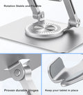 Rotatable & Convenient. With a 360° rotation base, you can freely adjust the angle of the tablet stand holder to set the best viewing angle that suits your preference, also making it extremely easy to share content.