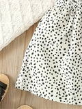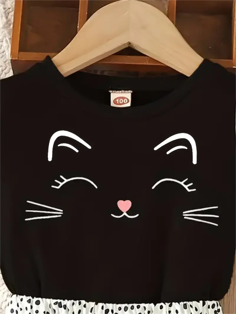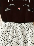 Girls 2-Piece Short Sleeve Top And Spotted Skirt, Smiling Kitten, Suitable For Girls Holiday Casual Dress, Costume Gift