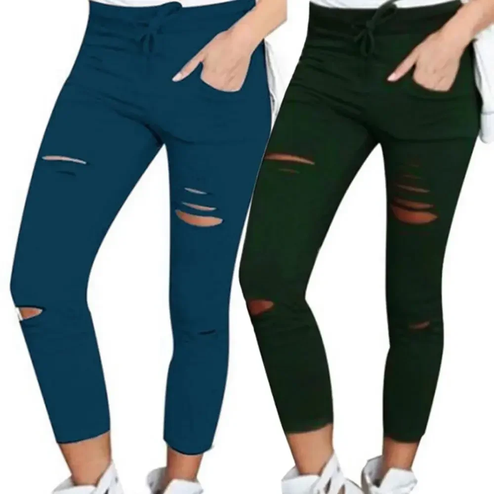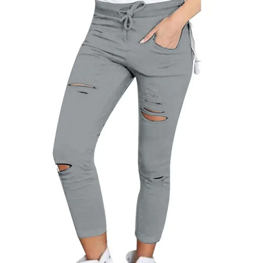 Features: Solid Color, Ripped Design, Skinny, Stretchy, Drawstring