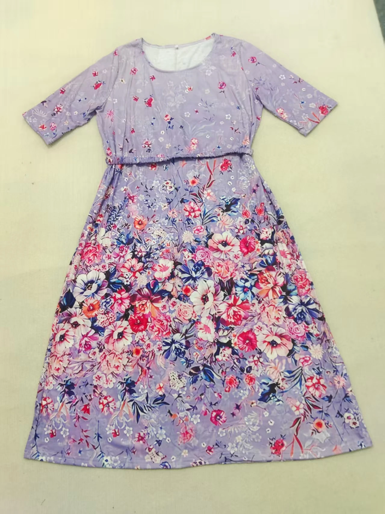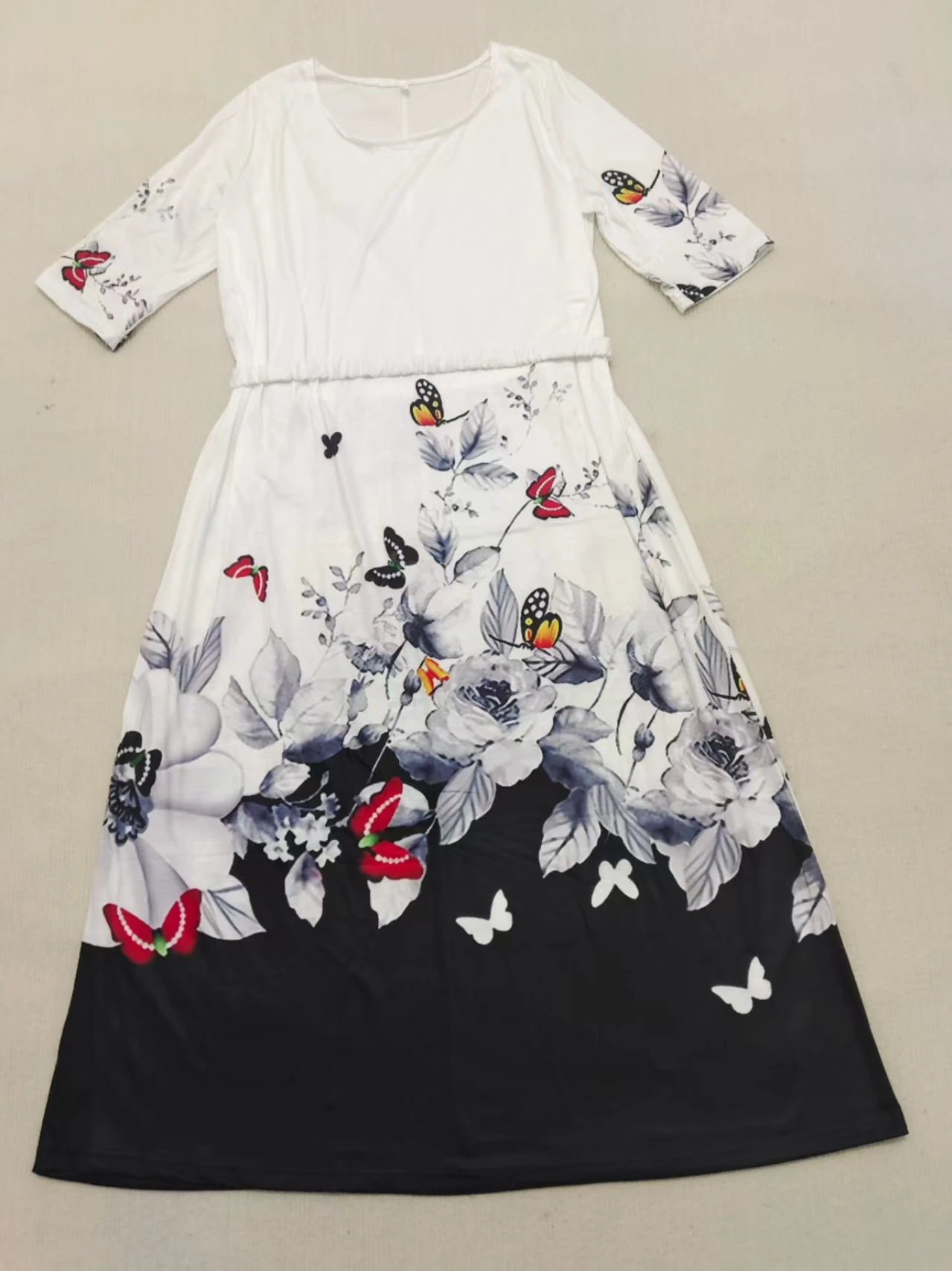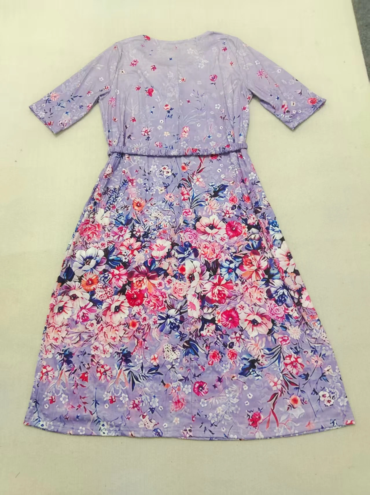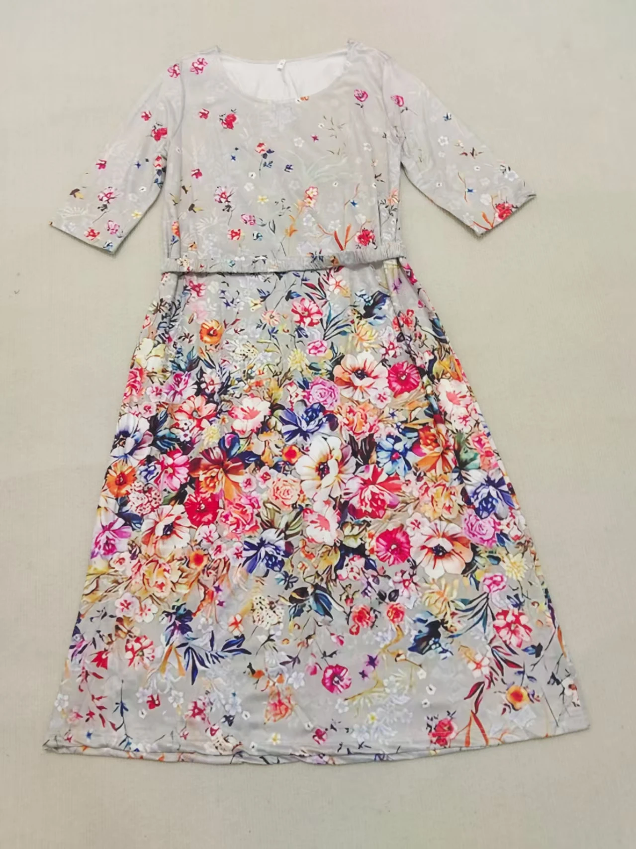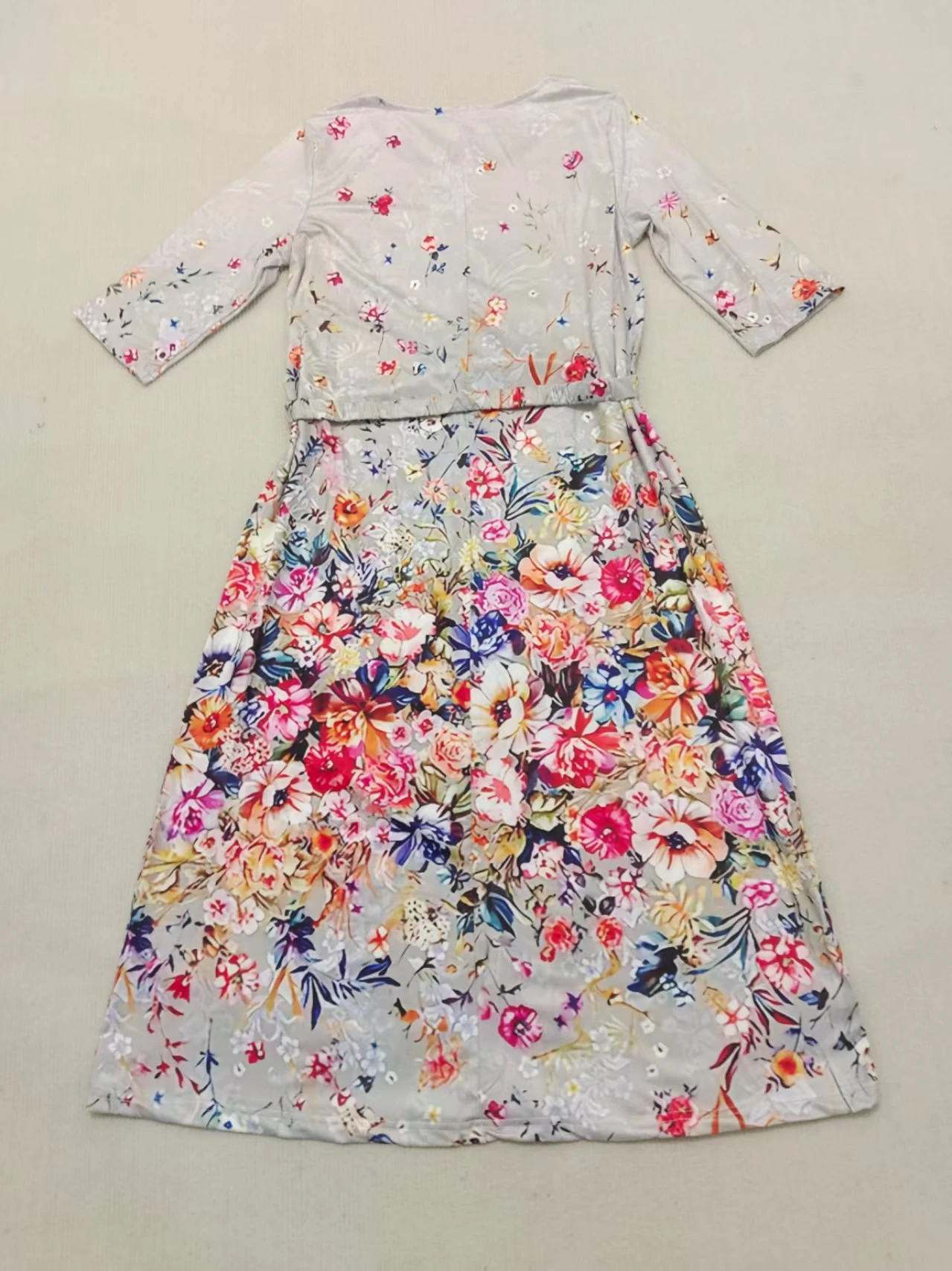 2025 European and American Summer Women's New Casual Floral Round Neck Mid-Length Straight Dress