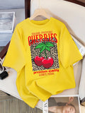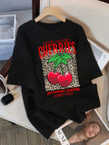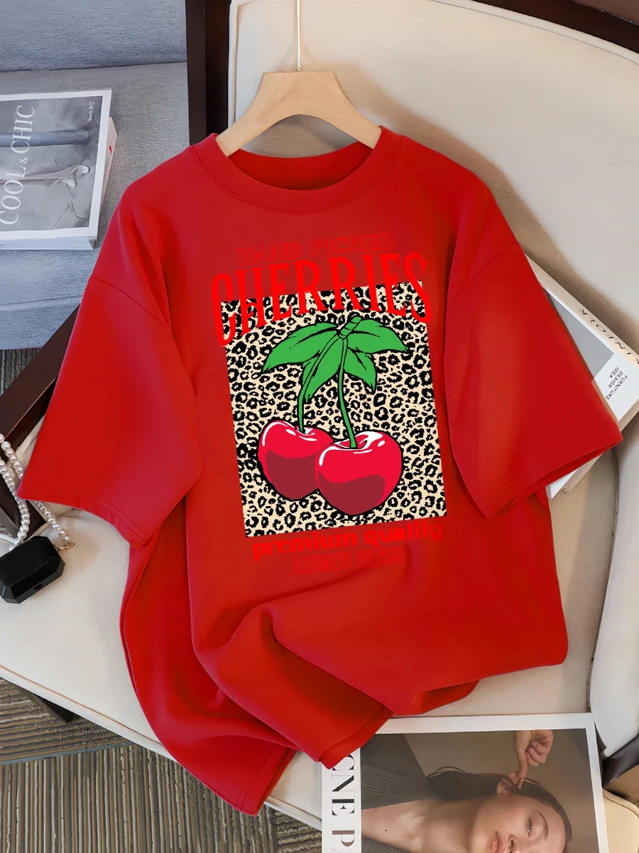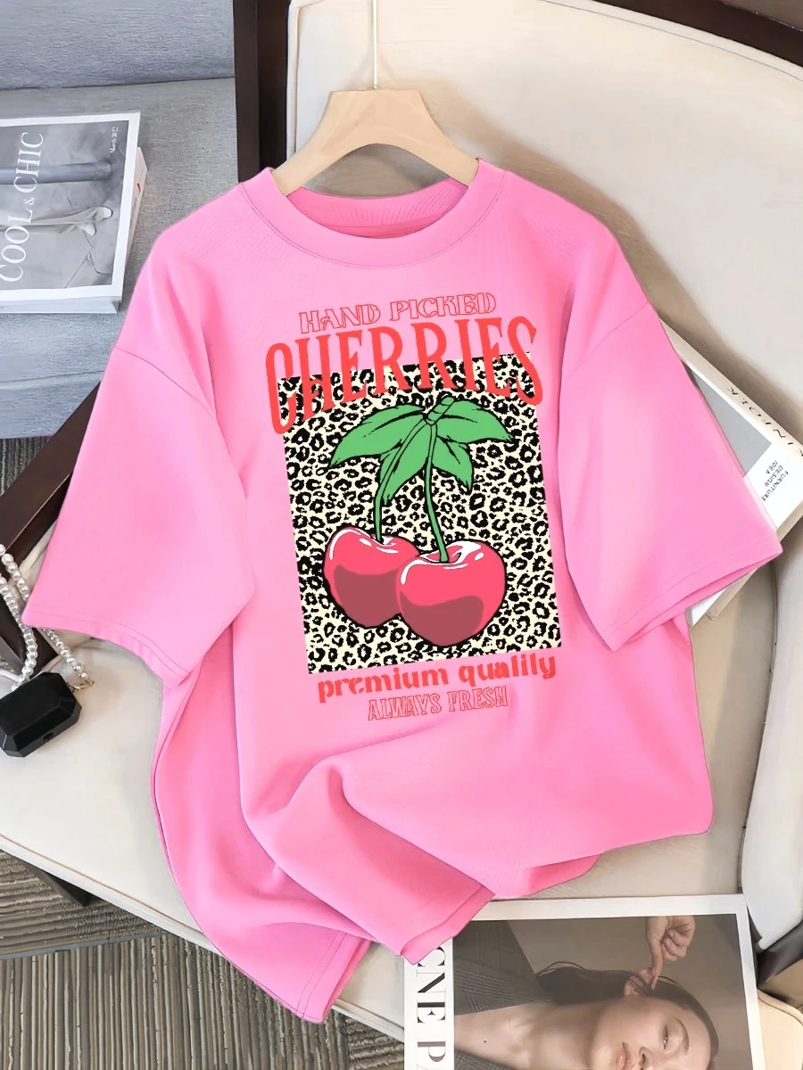T-shirt with Hand Picked Cherry Print for Women T-shirts with Round Neck Loose Summer Clothing Short Sleeve Multicolor