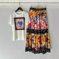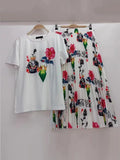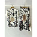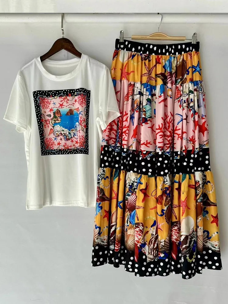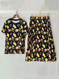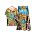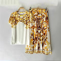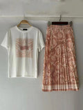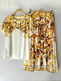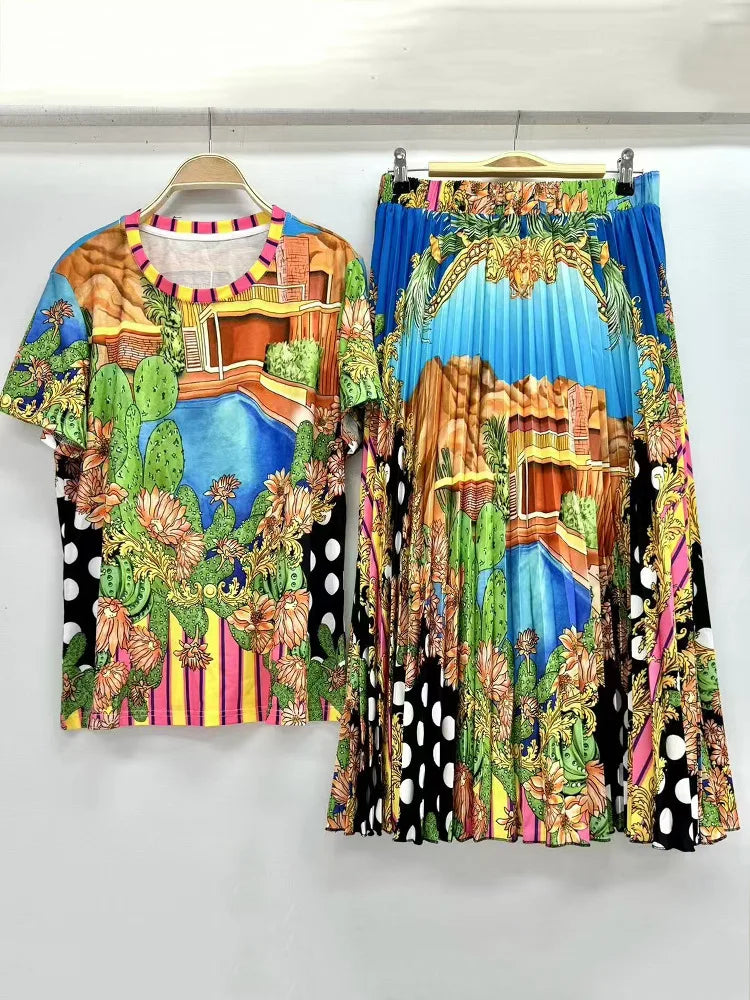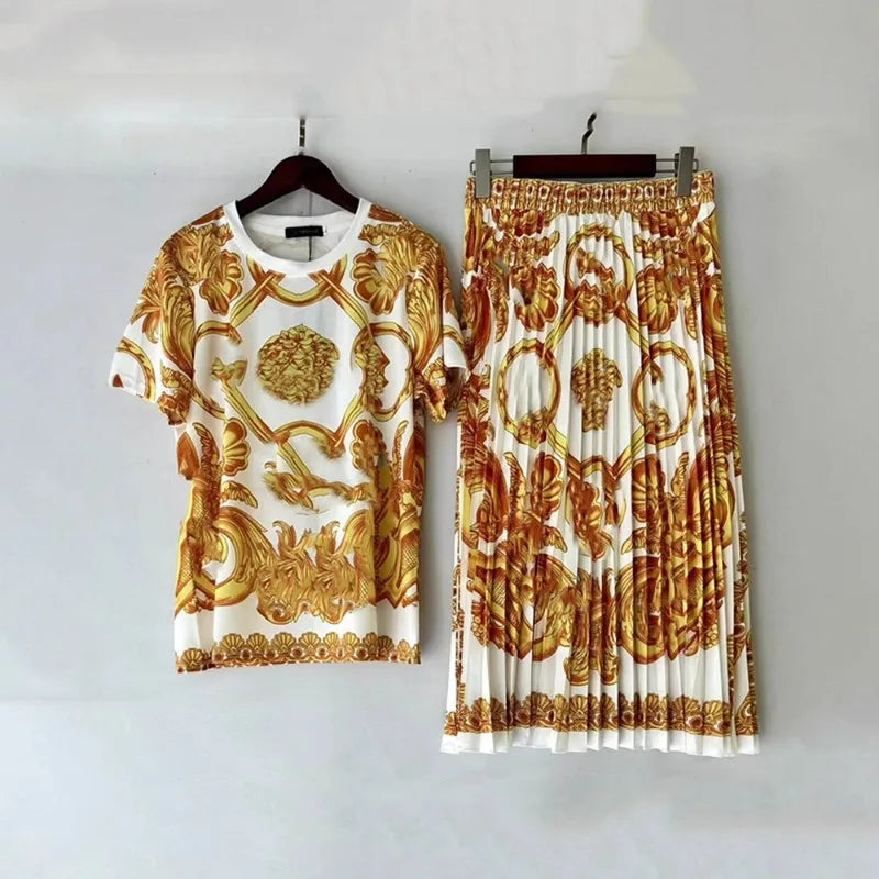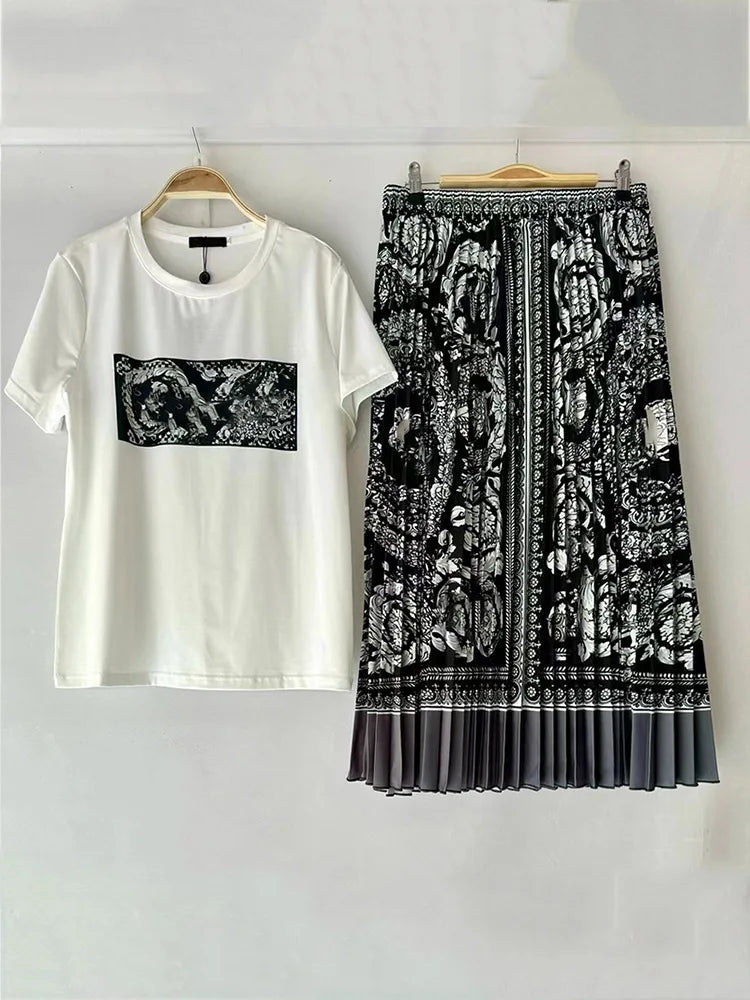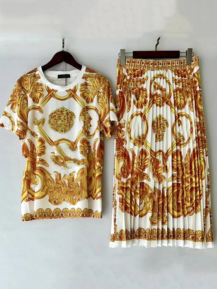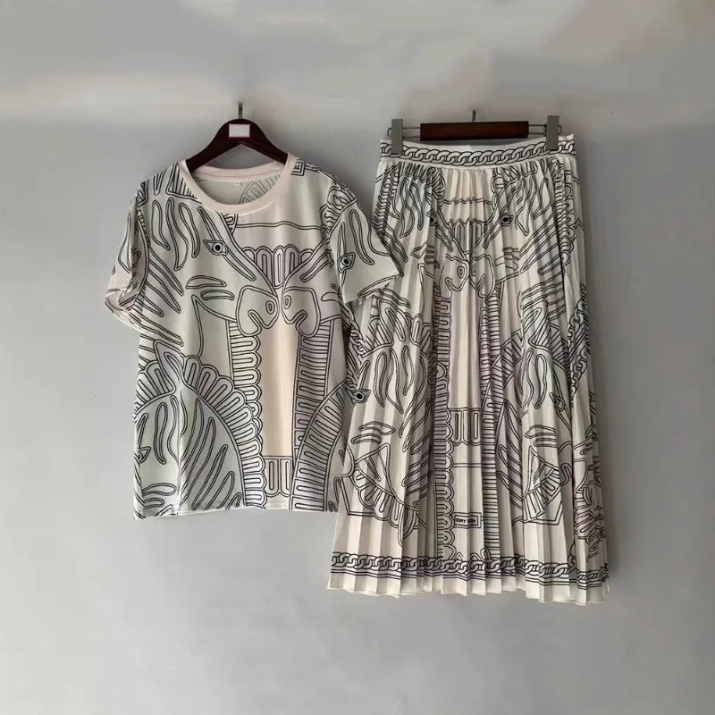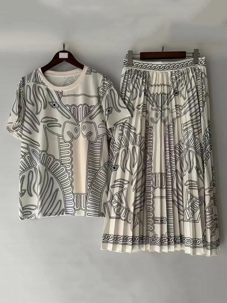 Women's Retro Geometric Print Straight Neck Short Sleeved Two-piece Set+high Waist Loose Pleated Skirt 2025 Summer Fashion Set