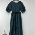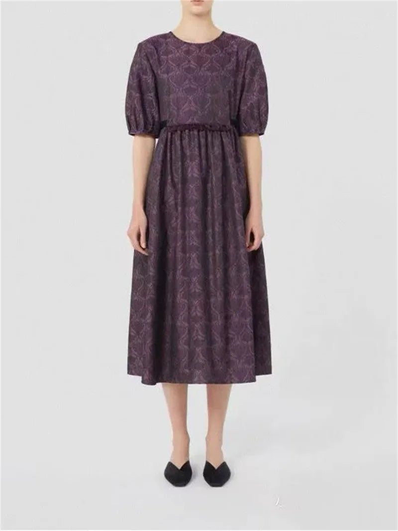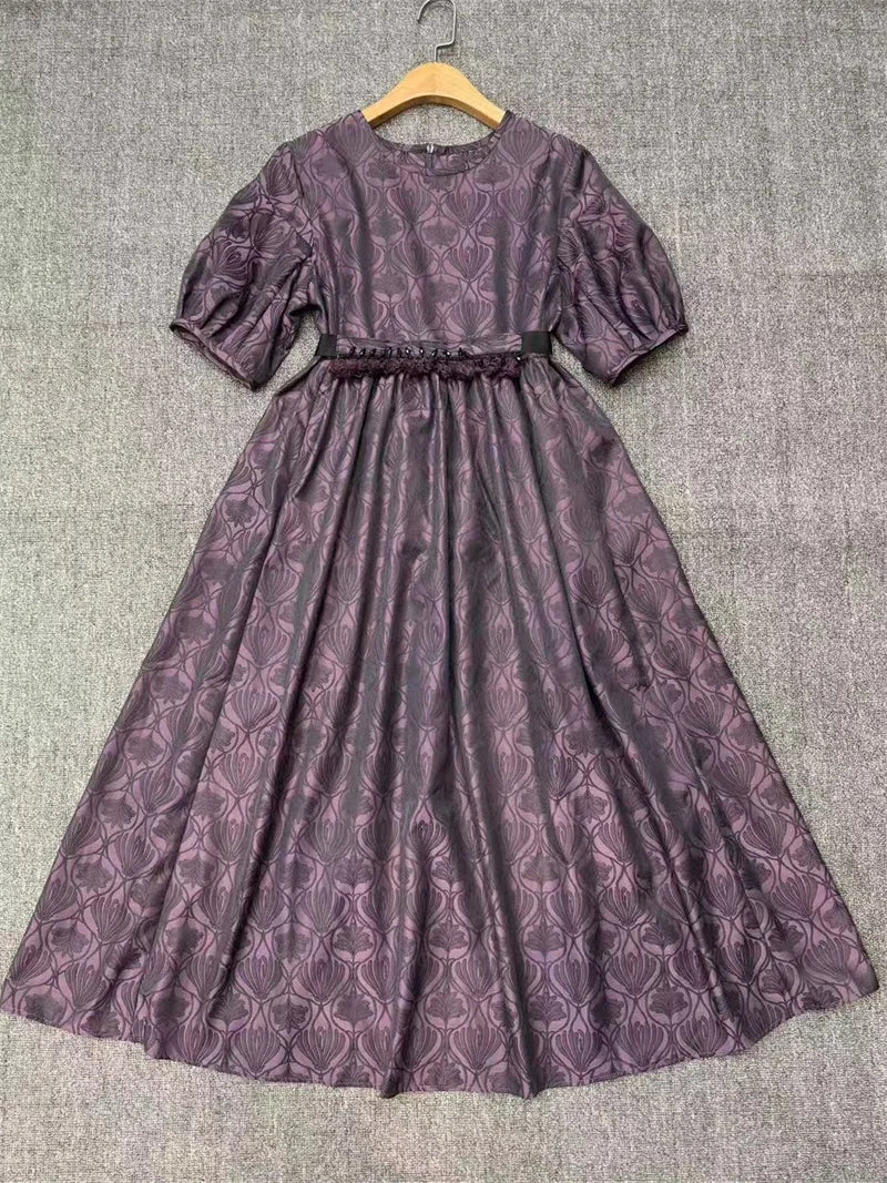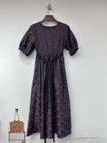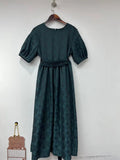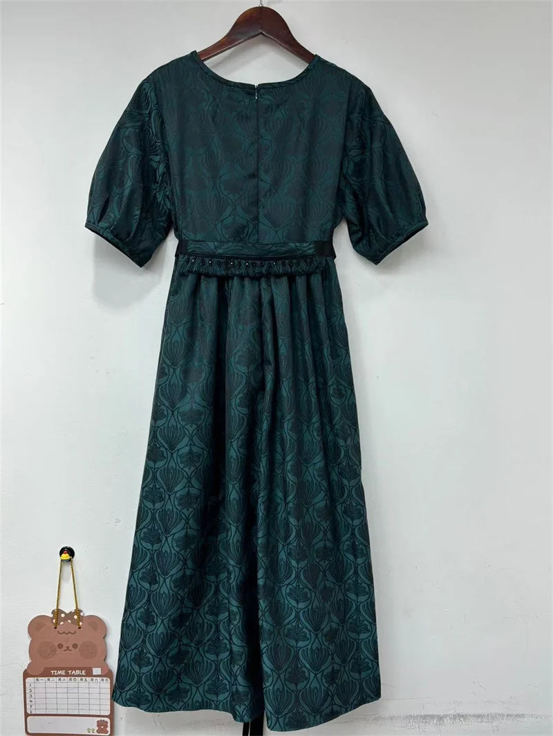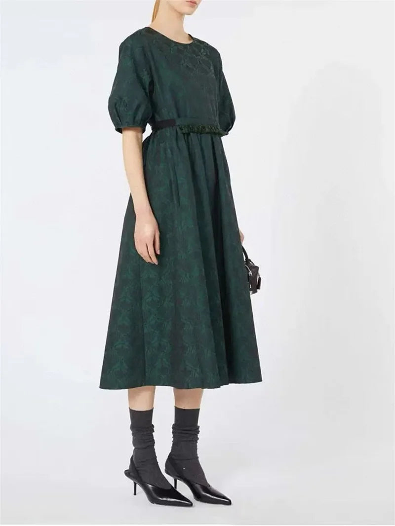 Tassel Beaded Belt Women Retro Jacquard Midi Dress Round Neck Short Puff Sleeve Ladies Slim High-Waisted A-Line Robe