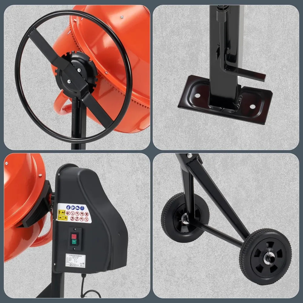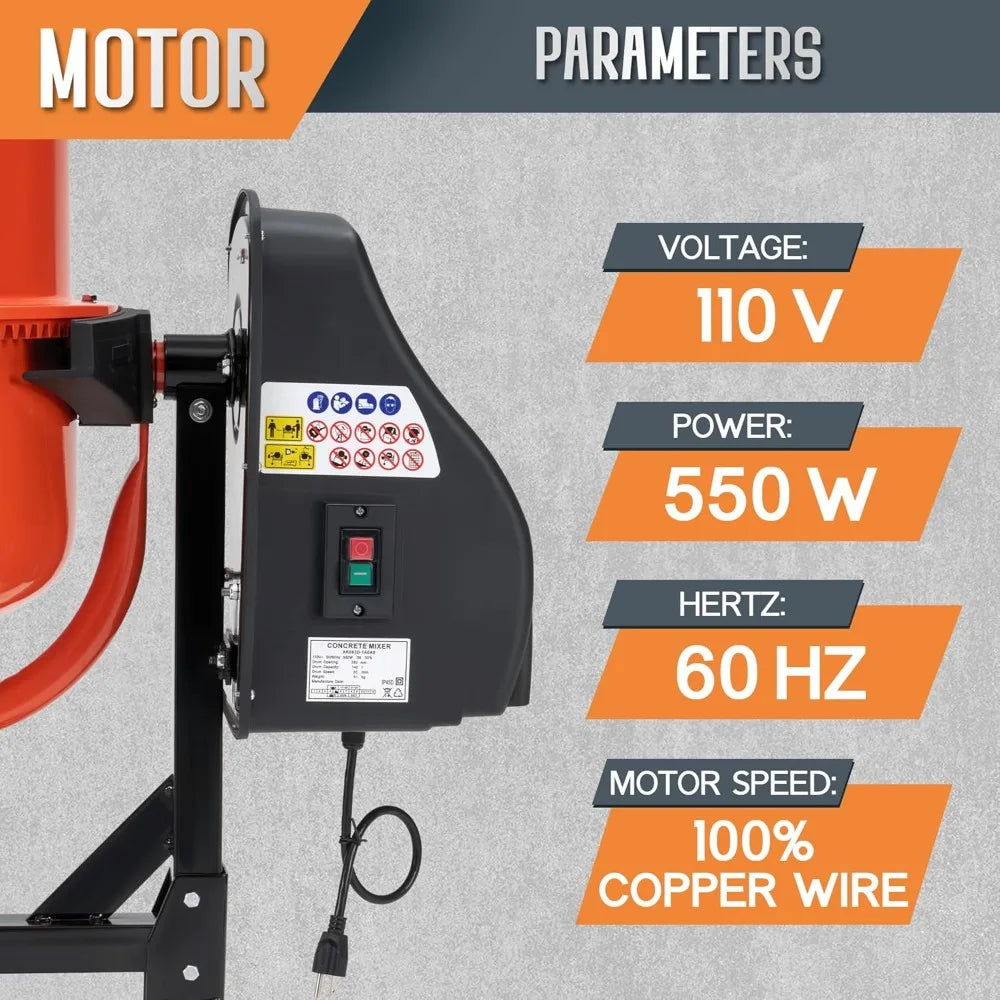- High-Efficiency Motor: Equipped with a high-torque 550W motor running at 30 RPM, this cement mixer offers consistent performance for concrete, mortar, stucco, and is ideal for commercial use and agricultural feed mixing