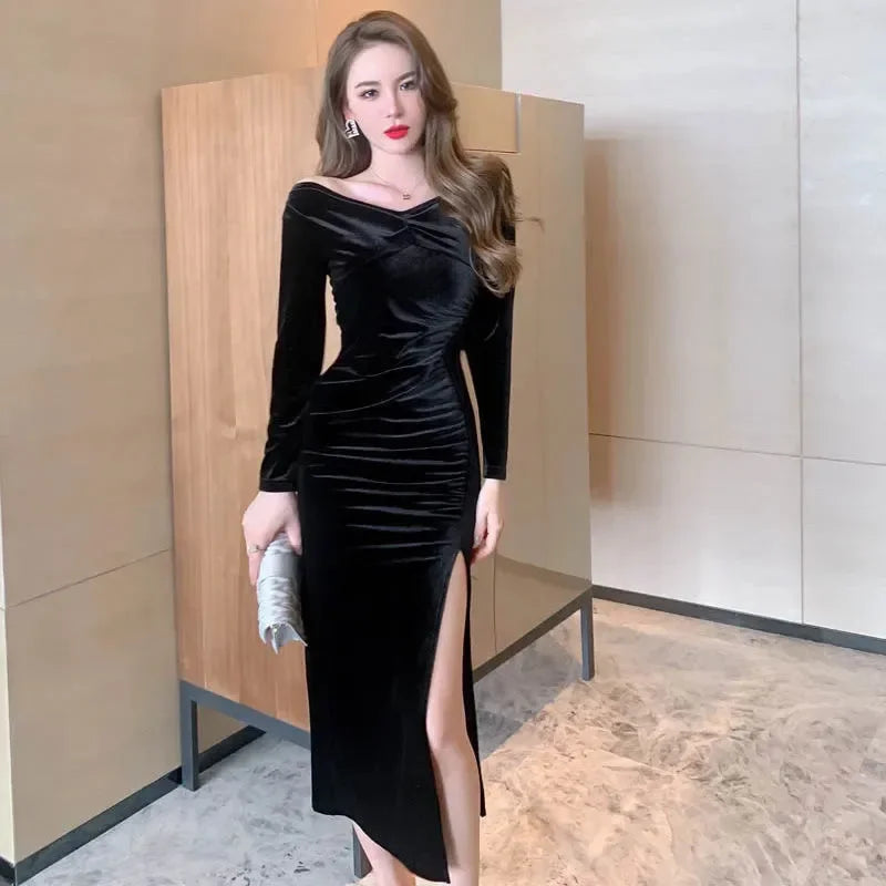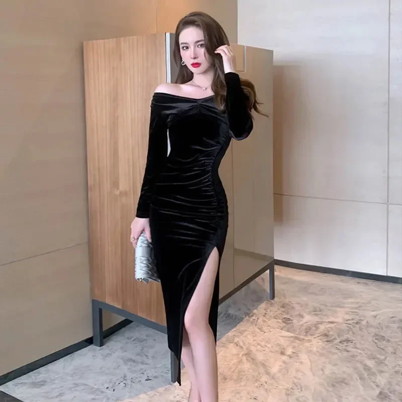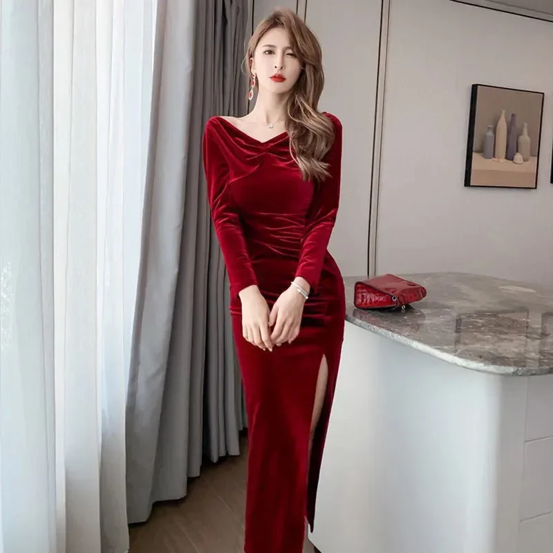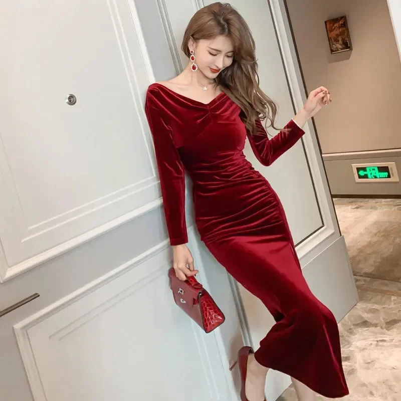 women dress Autumn Winter Fashion Slimming Velvet Dress V-Neck Waist Cinched Long Sleeve Midi Dress Versatile Inner Outer Wear Goddess Style